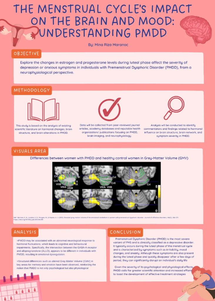 Featuring a field of healthcare that is commonly overlooked, Mina’s research focuses on hormonal fluctuations in the menstrual cycle and advances her studies by investigating their correlation with depressive symptoms.
